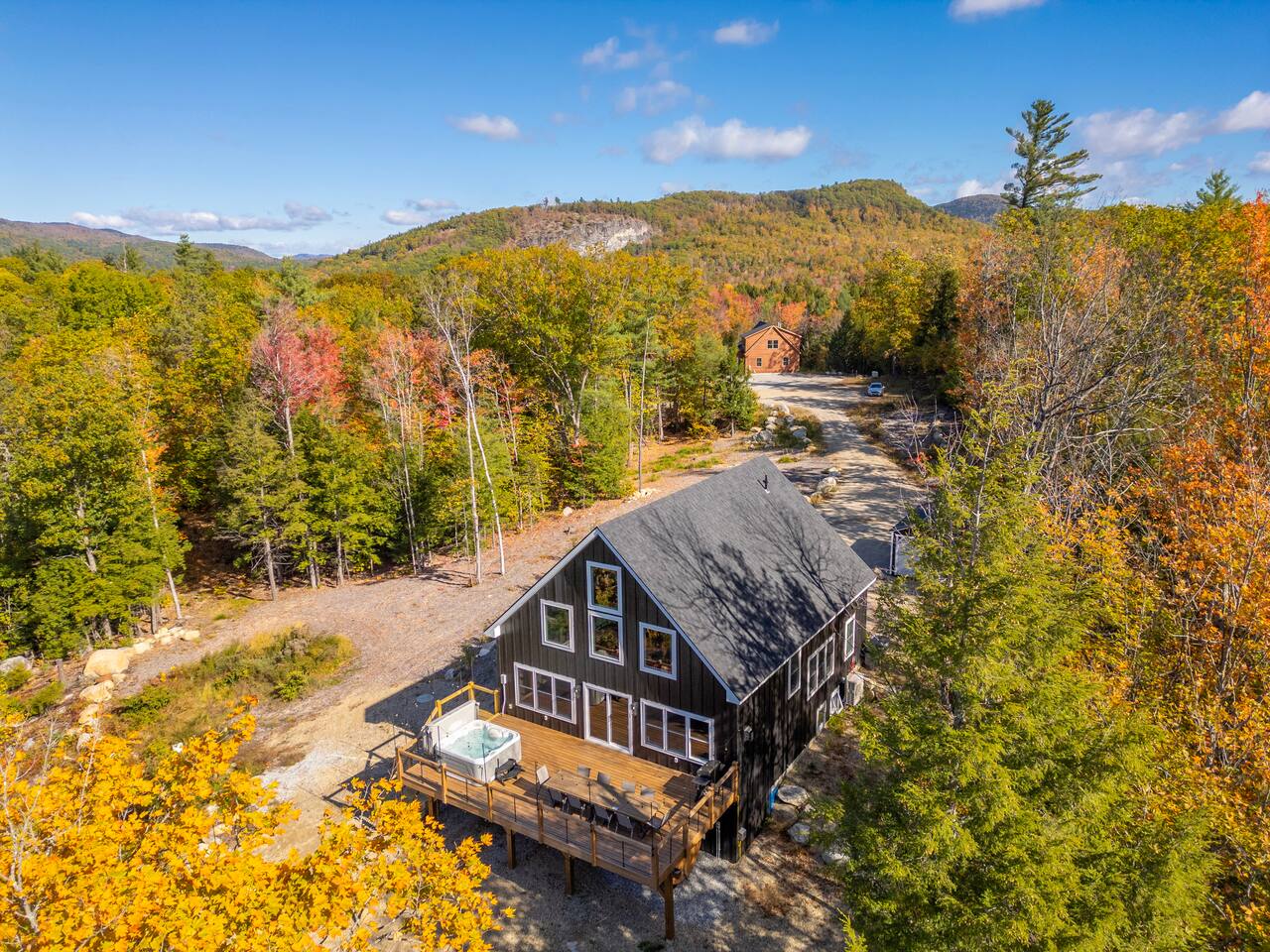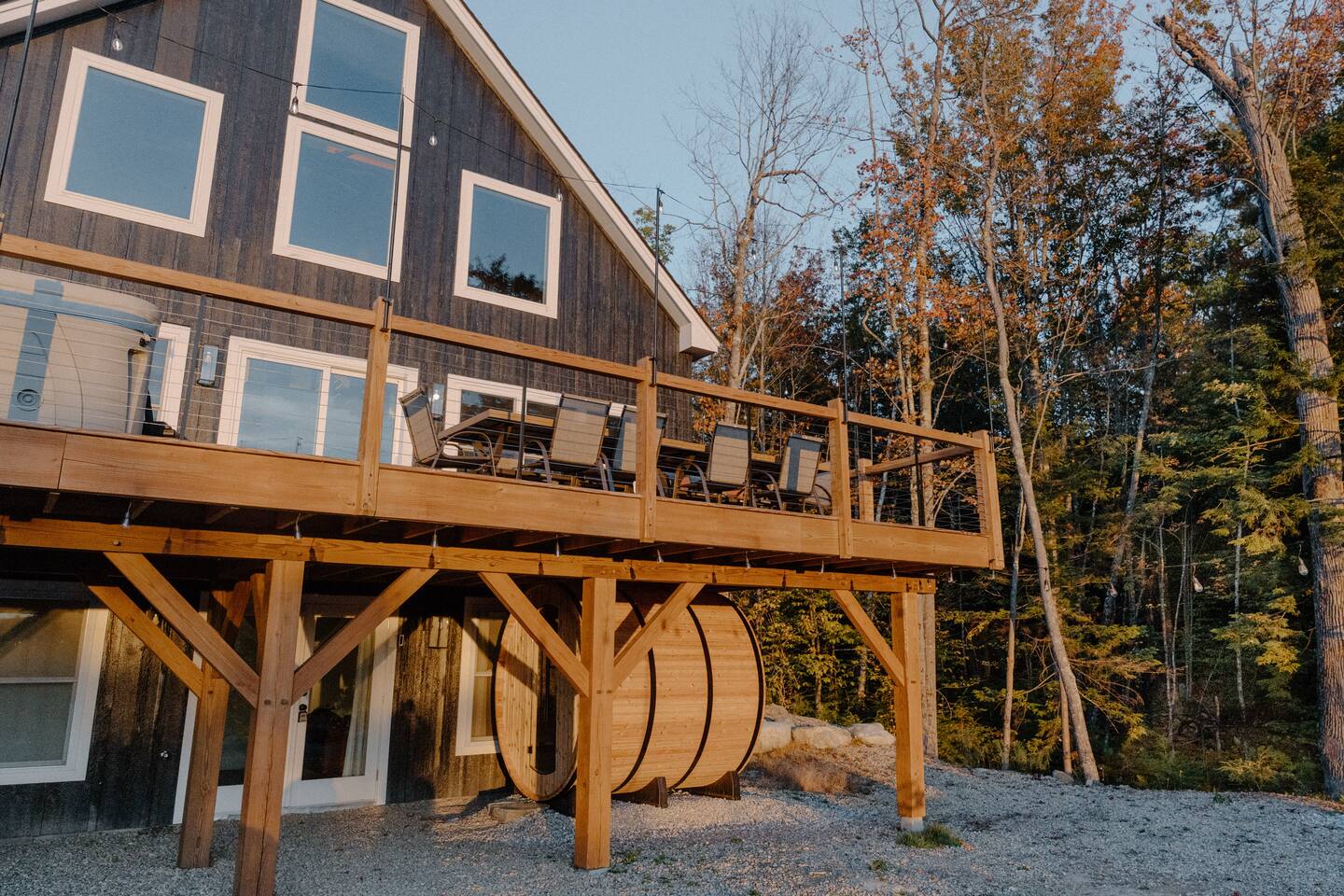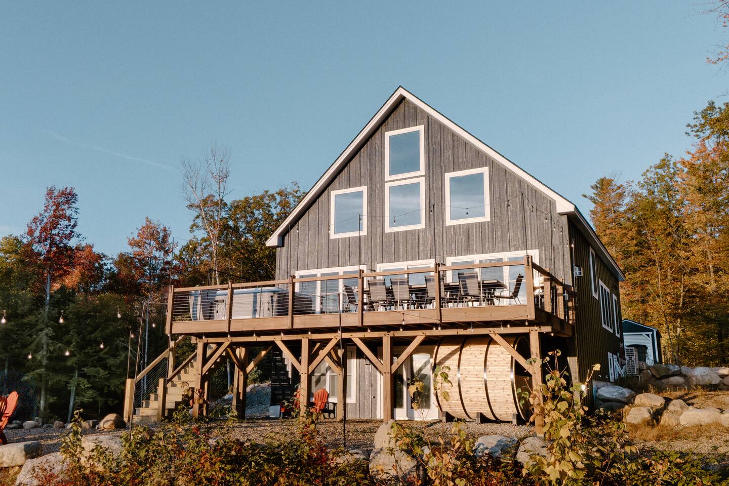 Welcome to Hygge Cabin, a newly built, luxurious cabin lakehouse minutes from the breathtaking South, North, and Round Pond near Woodstock, ME. hygge • ['hoo-ga] • (Danish) definition: creating a warm, cozy atmosphere and enjoying the good things in life with good people. When you stay here you will experience a warm, cozy atmosphere. This space is designed to be relaxing and to help you unplug and connect with your guests and nature. It has 5 total bedrooms with 5 King beds, 1 Queen, and 2 Fulls that will sleep 14 people comfortably. Plus 4.5 bathrooms to accommodate large groups. Outside: Barrel Sauna (BRAND NEW) Hot Tub on deck with lake views Fire pit String lights First Floor: 3 steps into our mudroom Queen Bedroom with a full tub/shower bathroom Master Bedroom with King and ensuite bathroom with vintage soaking tub. Full Kitchen, living room, and expansive deck. Top floor: Sitting area with sofa King bedroom Full bathroom with shower. Walkout basement: Family room King bedroom Bunk room with 2 kings & 2 twins Movie room Half bathroom Full bathroom with shower/tub Laundry room Please note: There is no AC in basement There are so many ways to relax and unwind: Take in the breathtaking views of the lake from the back patio in the premium hot tub to relax after a long day of hiking or skiing. Watch a movie with the family in our home movie theatre. Cozy up by the fireplace Summer time amenities include the fire pit, a dining set and gas grill. Offer from May to October Kitchen: Fully-equipped modern kitchen Stainless steel appliances Coffee Maker and Tea Kettle Living Room: Large sectional sofa Rustic fireplace for cozy evenings Open-concept space for family gatherings Entertainment: Game room with board games Home movie theatre Flat-screen TVs with streaming services Swimming areas: Littlefield Beach (3 mins) at South Pond is a pay-to-access beach area. You must reserve a campsite space ahead of time to park your vehicle and get access to the beach. We recommend reserving your spot when booking. Go to Littlefield Beaches website to book. Public beaches and swimming holes are nearby, such as Angevine Park Swim Pond (15 mins) near Bethel. Near Sunday River (30 mins), Artists' Covered Bridge, Letter S, Frenchman's Hole, & Honey Hole.