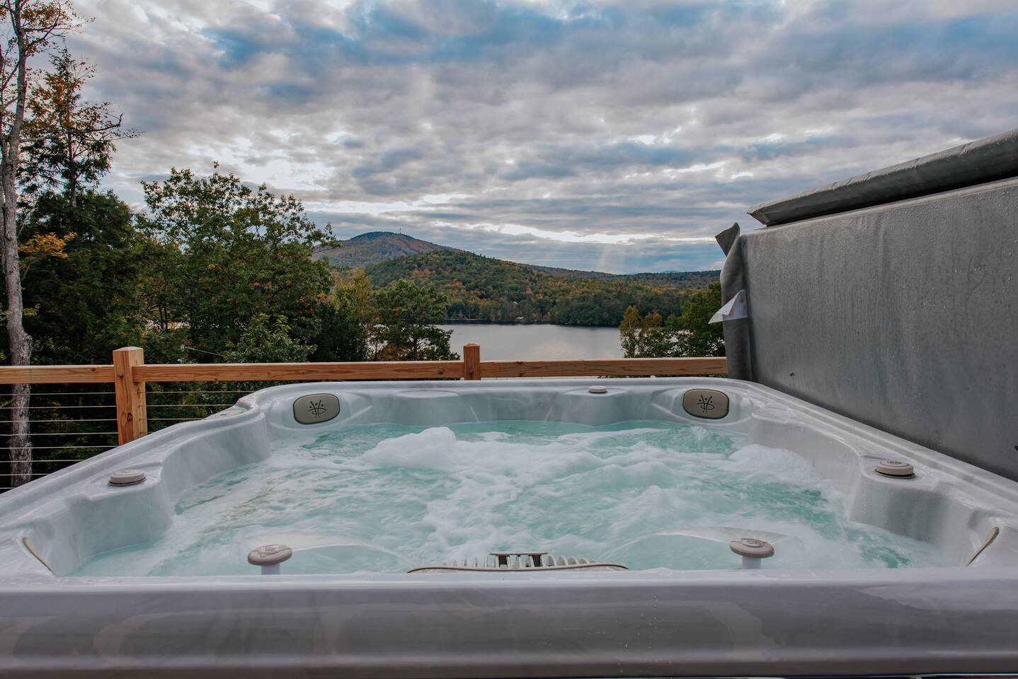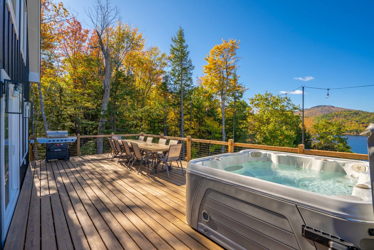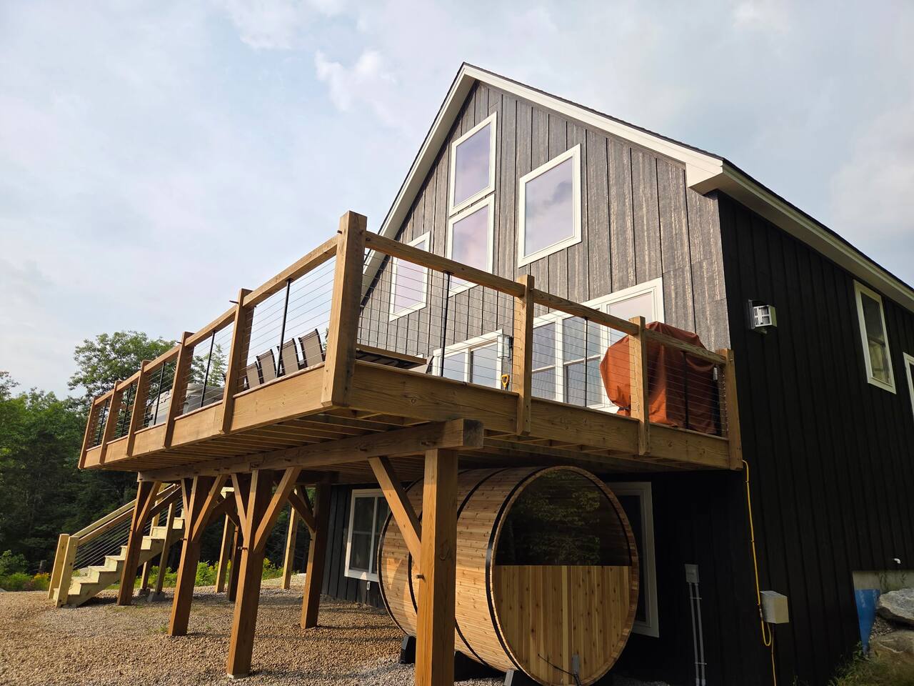Welcome to Hygge Cabin, a newly built, luxurious cabin lakehouse minutes from the breathtaking South, North, and Round Pond near Woodstock, ME. hygge • ['hoo-ga] • (Danish) definition: creating a warm, cozy atmosphere and enjoying the good things in life with good people. When you stay here you will experience a warm, cozy atmosphere. This space is designed to be relaxing and to help you unplug and connect with your guests and nature. It has 5 total bedrooms with 5 King beds, 1 Queen, and 2 Fulls that will sleep 14 people comfortably. Plus 4.5 bathrooms to accommodate large groups. Outside: Barrel Sauna (BRAND NEW) Hot Tub on deck with lake views Fire pit String lights First Floor: 3 steps into our mudroom Queen Bedroom with a full tub/shower bathroom Master Bedroom with King and ensuite bathroom with vintage soaking tub. Full Kitchen, living room, and expansive deck. Top floor: Sitting area with sofa King bedroom Full bathroom with shower. Walkout basement: Family room King bedroom Bunk room with 2 kings & 2 twins Movie room Half bathroom Full bathroom with shower/tub Laundry room Please note: There is no AC in basement There are so many ways to relax and unwind: Take in the breathtaking views of the lake from the back patio in the premium hot tub to relax after a long day of hiking or skiing. Watch a movie with the family in our home movie theatre. Cozy up by the fireplace Summer time amenities include the fire pit, a dining set and gas grill. Offer from May to October Kitchen: Fully-equipped modern kitchen Stainless steel appliances Coffee Maker and Tea Kettle Living Room: Large sectional sofa Rustic fireplace for cozy evenings Open-concept space for family gatherings Entertainment: Game room with board games Home movie theatre Flat-screen TVs with streaming services Swimming areas: Littlefield Beach (3 mins) at South Pond is a pay-to-access beach area. You must reserve a campsite space ahead of time to park your vehicle and get access to the beach. We recommend reserving your spot when booking. Go to Littlefield Beaches website to book. Public beaches and swimming holes are nearby, such as Angevine Park Swim Pond (15 mins) near Bethel. Near Sunday River (30 mins), Artists' Covered Bridge, Letter S, Frenchman's Hole, & Honey Hole.